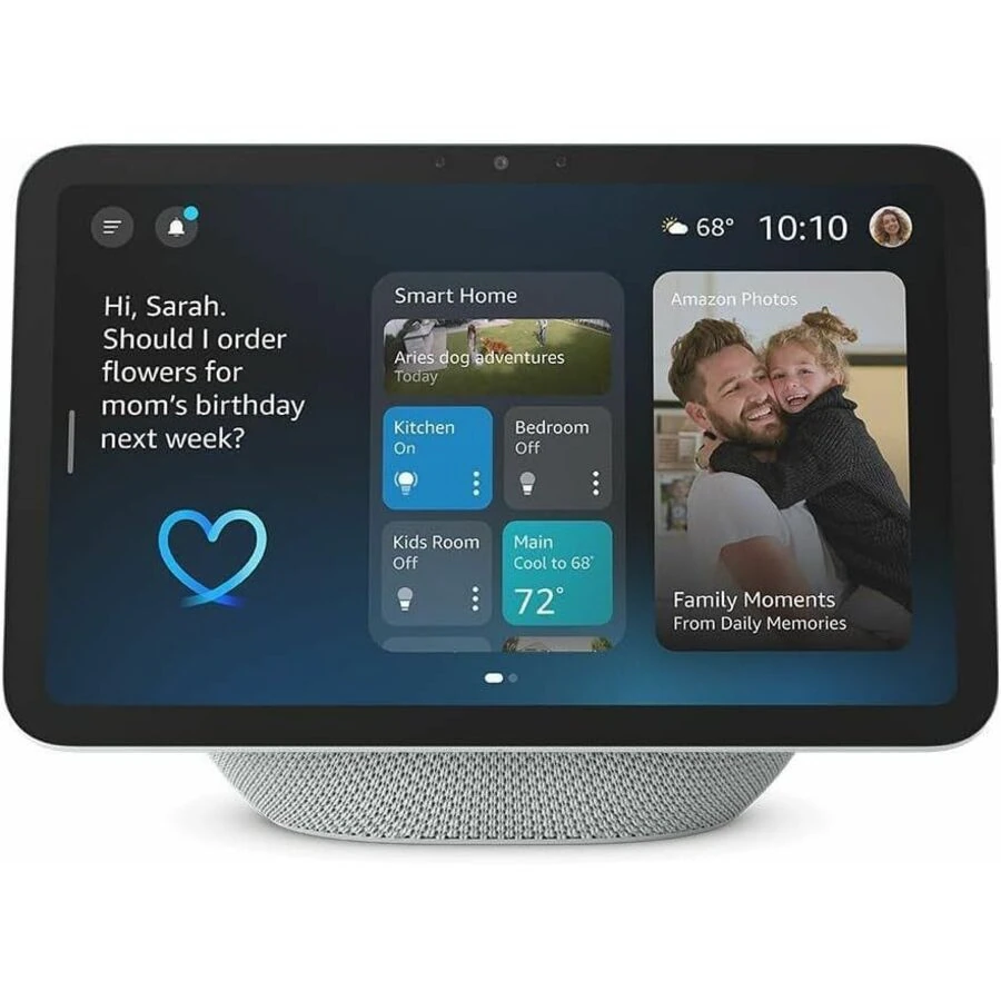 Best for households wanting screen + voice control in one compact device. The 8-inch touchscreen is large enough to display recipes, video calls, or security feeds without dominating your countertop. Alexa's voice recognition works reliably in kitchens (noisy environments), and integration with Amazon Photos means you can display family albums on rotation. The built-in speaker is adequate for small rooms; if you need serious audio, pair it with external speakers via Bluetooth.